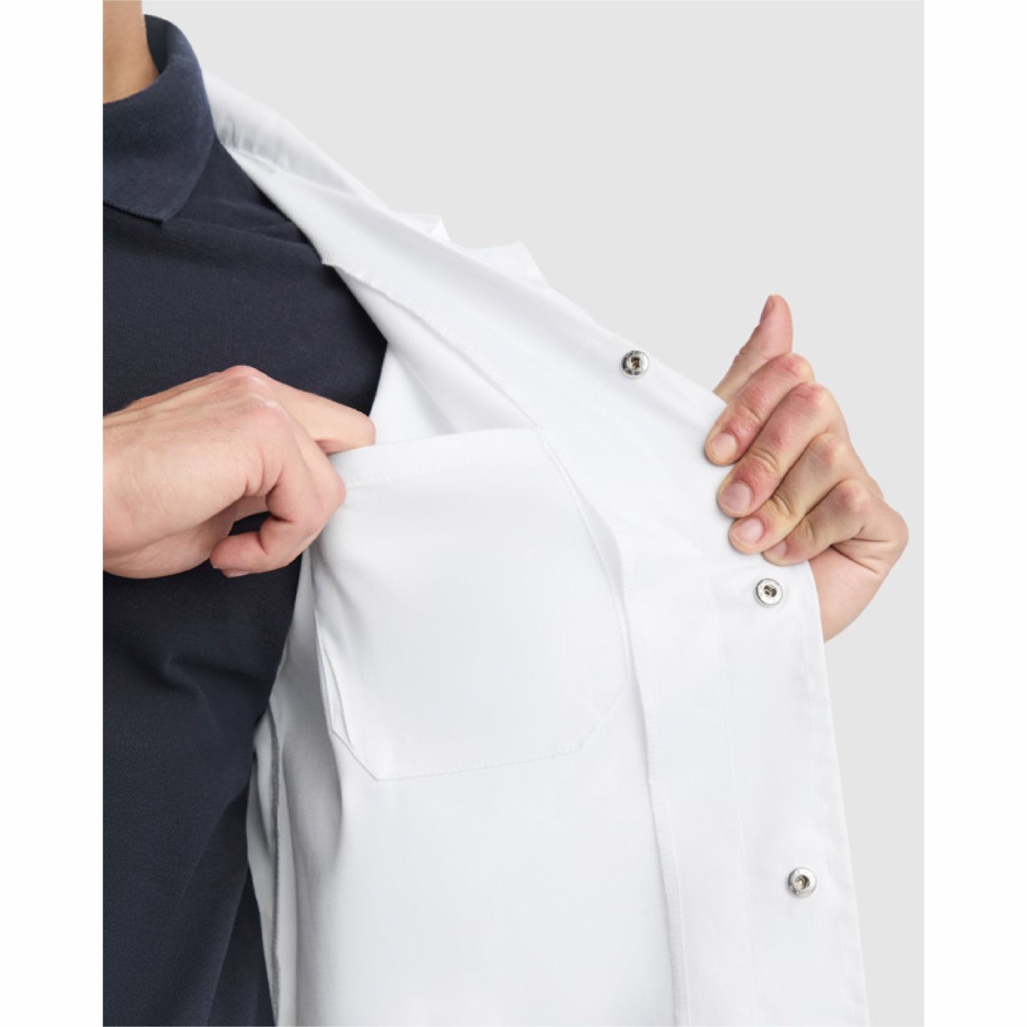 - Sistema de Cierre Higiénico: A diferencia de las batas comunes, el modelo Mederi utiliza botones metálicos a presión que son antioxidantes, lo que permite lavados industriales frecuentes. Al estar ocultos por una tapeta, se elimina el riesgo de que un botón caiga accidentalmente en una línea de producción o dañe superficies delicadas.