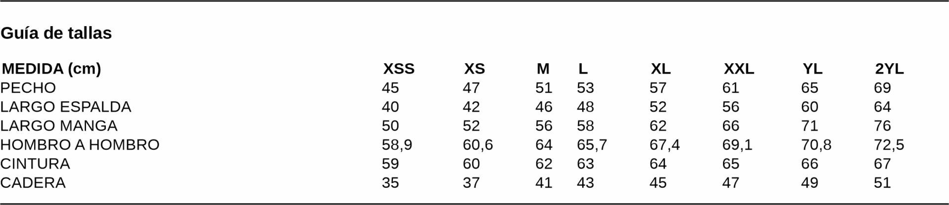 TallaXSS, XS, S, M, L, XL, XXL y YL. |