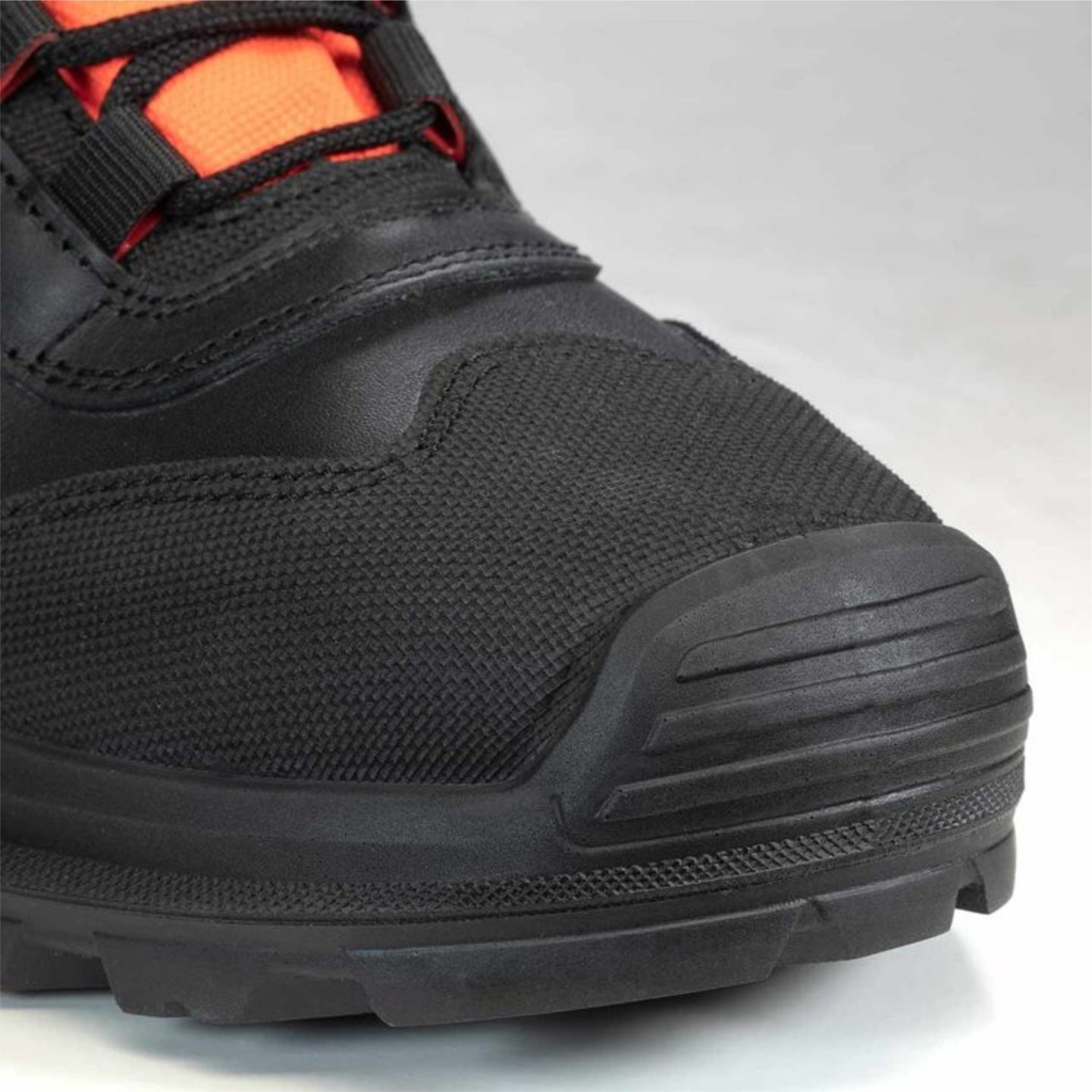 - Corte exterior: La construcción en piel plena flor hidrófuga con insertos textiles bloquea la penetración de fluidos, mientras la puntera antiabrasión prolonga la vida útil frente a roces mecánicos en el área frontal.