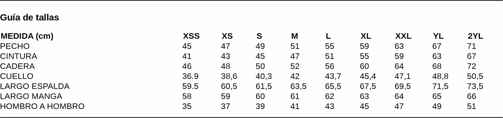 TallaXS, S, L, XL, XXL y YL. |
