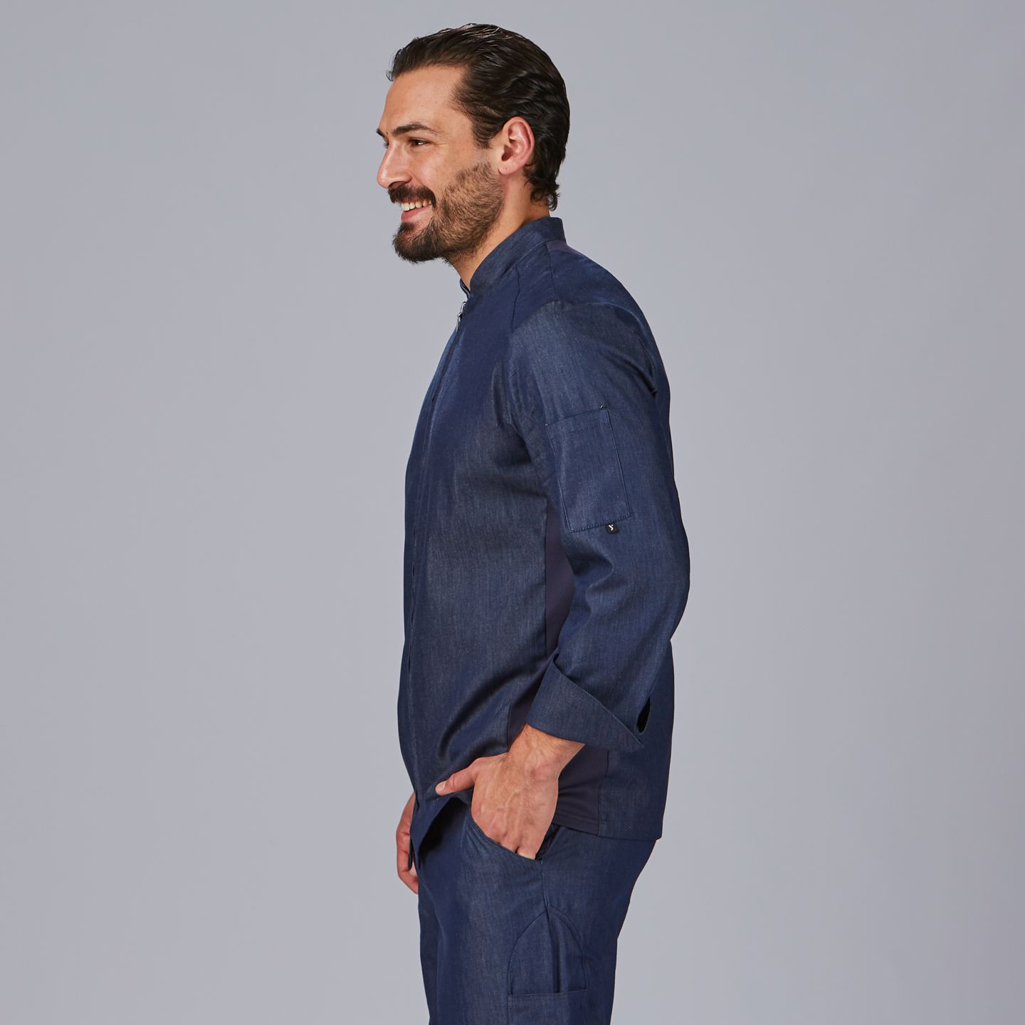 Confeccionada en tejano elástico Zafiro 98% algodón y 2% elastano de 160 g/m², ofrece durabilidad, flexibilidad y confort. Su diseño semi ajustado H2 permite libertad de movimiento, mientras que el cierre frontal con cremallera y botones de presión ocultos proporciona una imagen profesional y limpia.